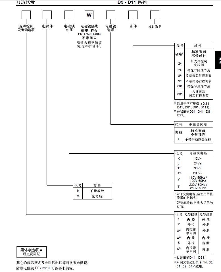 D31 D41 D81 D91和D111系列是电液操控的3位4通或3位4通滑阀式电磁方向阀,并由一NG6电磁阀进行先导控制。先导控制油的压力和流量对主滑动阀芯的换向响应时间有重要的影响。为了保证换向可靠,应选择恰当的的控制油源和泄油选项。