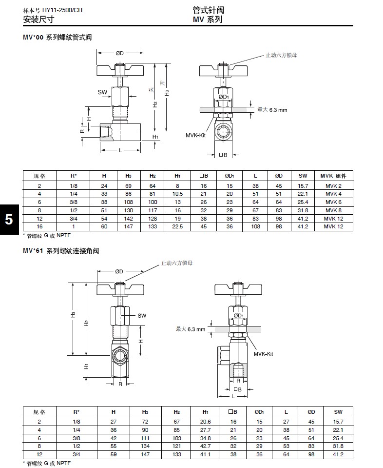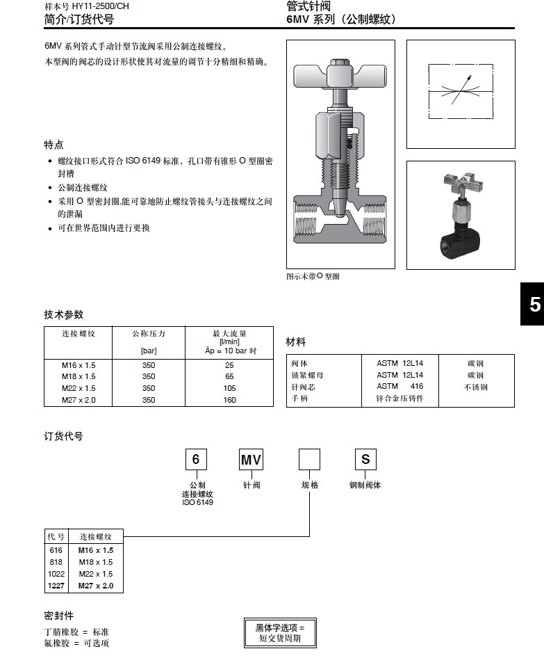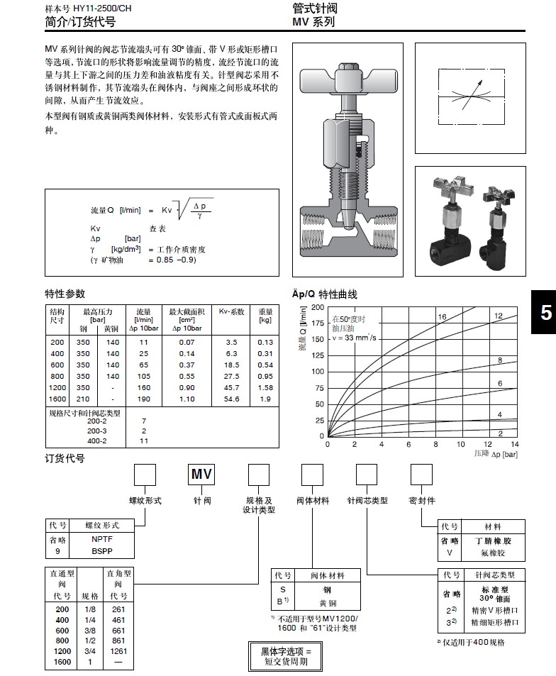 MV系列针阀可以选择30度-锥面、V形切口或矩形切口的阀芯。节流口的形状影响流量调节的精度,其与压力和粘度有关。针状阀芯为不锈钢并且在阀筒内形成环状间隙。可以选择钢质或黄铜阀体以及管式安装或面板安装。