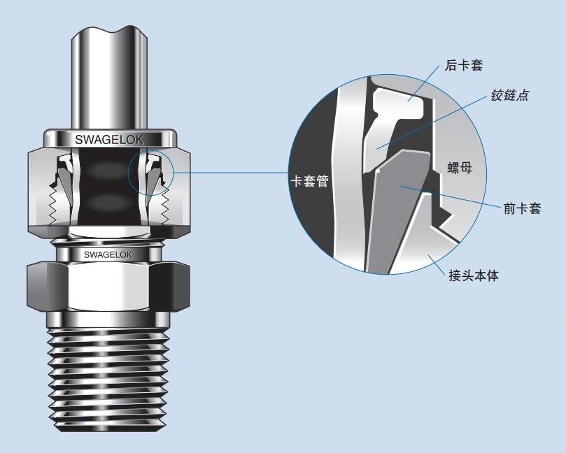 这是 1/4 至 1/ in. 和 6 至 1 mm 世伟洛克不锈钢卡套管接头的标准设计,其目的是帮助安装人员完成更加坚固的防泄漏卡套管连接。在这些尺寸中,一种获得专利的表面硬化工艺以及获得专利的凹槽和特定断面几何形状为世伟洛克后卡套提供了独一无二的工程学特点。具有铰链-夹箍作用的后卡套设计不仅进一步增强了传统卡套设计所具有的坚固性能,而且还提供了:
