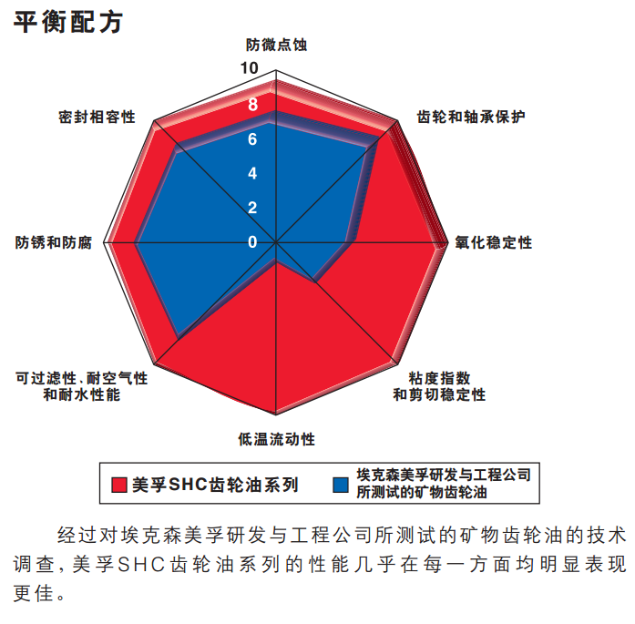 美孚SHC齿轮油系列产品采用先进的添加剂专利技术,设计为工业用齿轮箱提供针对胶合等各种磨损类型的杰 出的耐磨保护,并且具有高级的防微点蚀疲劳性能。此外,与埃克森美孚研发与工程公司所测试的矿物齿轮润滑油 产品相比,美孚SHC齿轮油系列能为齿轮箱的滚动元件轴承提供更好的润滑。美孚SHC齿轮油系列产品具有优秀 的防锈和防腐蚀性能,即使在湿润的环境中也不会有导致精滤清器堵塞的趋势。同时,在高温环境下,美孚SHC齿轮油 系列产品具有优异的黑色金属及有色金属相容性能。
